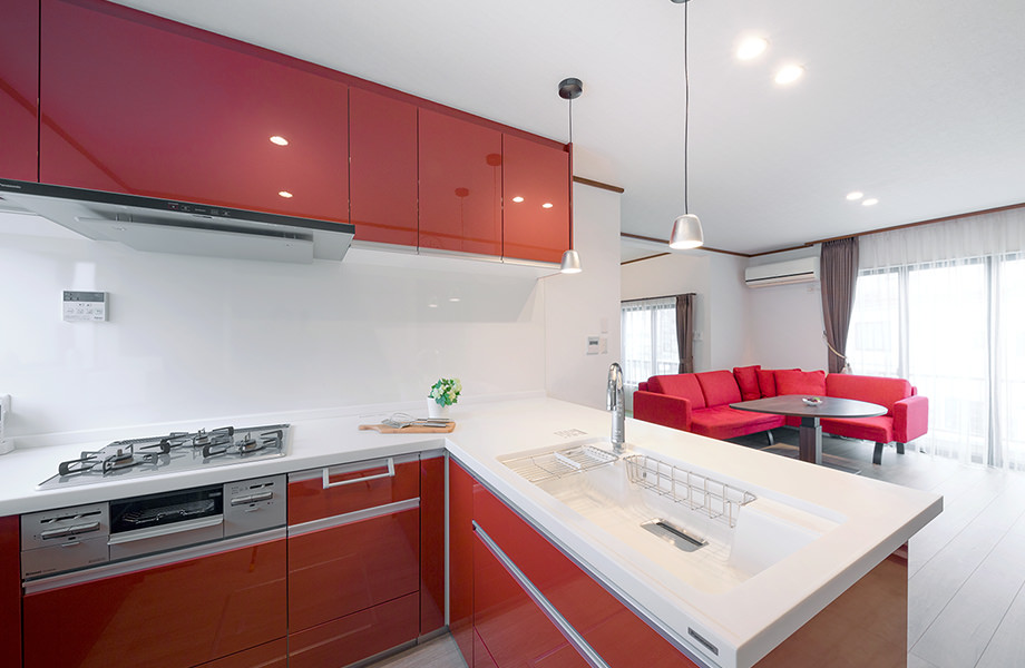 2階のL字型キッチンは、リビングへの入り口の位置を変えて、コの字型のシステムキッチンに変更。キッチンの鮮やな赤色がLDK全體のアクセントとなり、明るい色合いの団らん空間になりました。