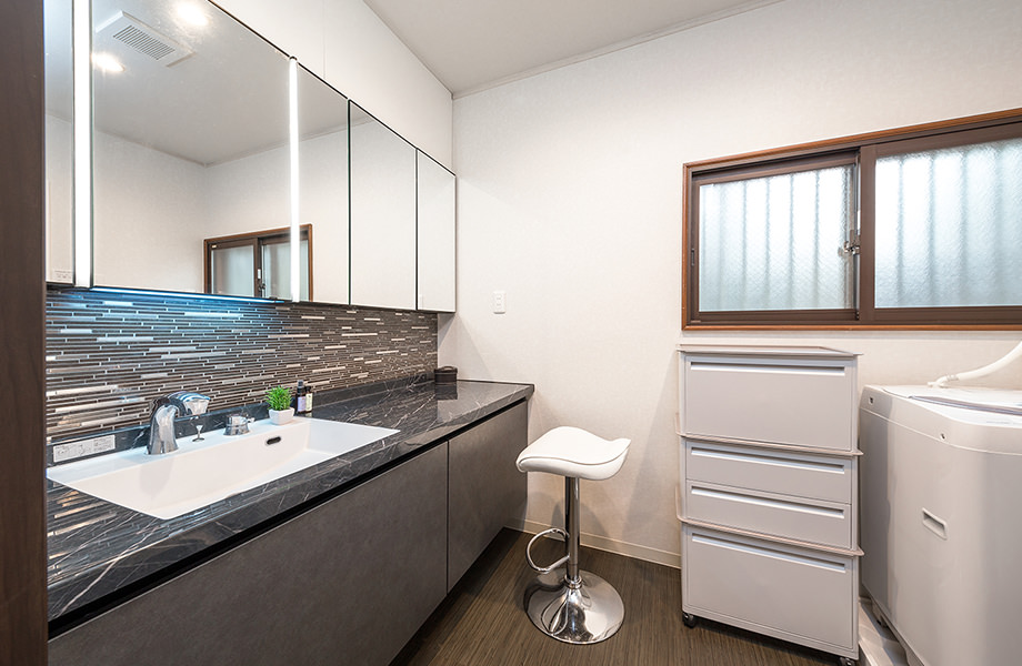 洗面室も一新し、リビングとトーンを合わせてダークな色の洗面臺をセレクト。鏡の下にはタイルを貼って落ち著いた色調の仕上がりに。床には素足でも心地良い籐のフロアタイルを採用しています。窓は二重窓にし、斷熱性能を高めました。