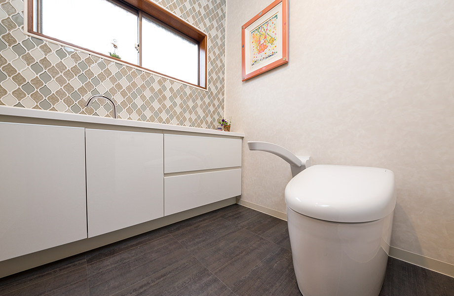 もともと広かったトイレは少し縮小して一部を収納にし、程よい広さに変更。たっぷりと入る壁面収納を設け、O様が気に入られたタイルを使ってコーディネートし、気持ちよく過ごせる空間へと変わりました。