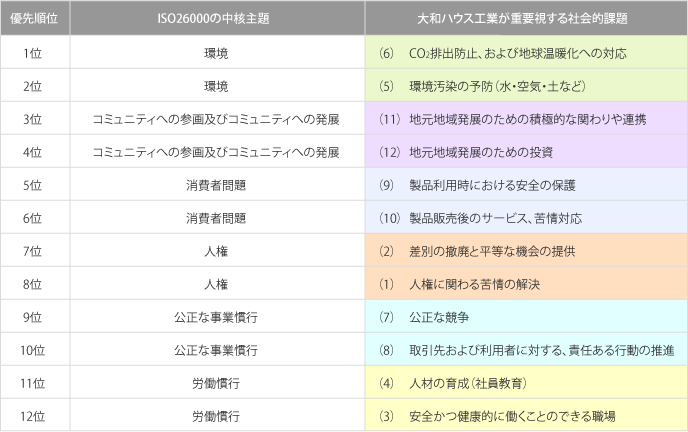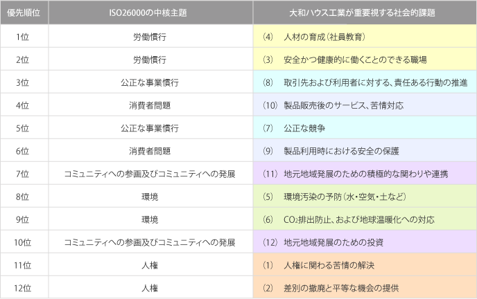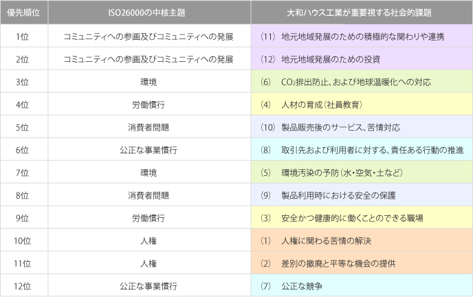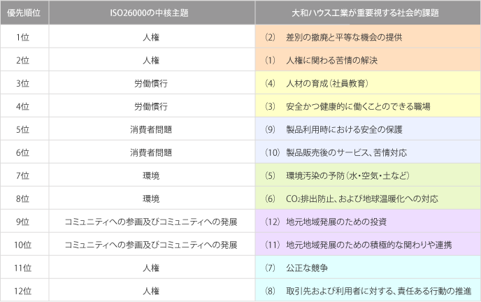 中位(第5位)以降については、各課題が「社會全體として重要なテーマであるか」に加え、大和ハウス工業(yè)の社員と同じ現(xiàn)場で働かれているステークホルダーとして「実感できるものか(身近さ)」を考慮し順位付けを行いました。