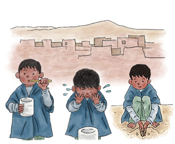 第1の水場では、料理や顔を洗うための水を汲みます。1日に使うことができる水の量はかぎられています。たとえば身じたくをするときは、コップ1杯の水で、歯を磨き、目の周りと手や口を洗います。家にお風呂はなく、體を拭く程度です。次の水場では女性たちが洗たくをしたり、子どもたちが水遊びをします。そこからさらに下流には動物に水を與えるための水場があり、最後に集落の人びとが食べる穀物や野菜を栽培している農園(ブスターン)へと流れ込んでいく仕組みになっています。貴重な水を誰がどれだけ使っていいかというのは、古老(ころう)と呼ばれる年長の人が決めることになっていて、農園への水量を測るのには特別な道具を使い、臺帳に記された量を配分して水爭いが起きないように管理しているのです。