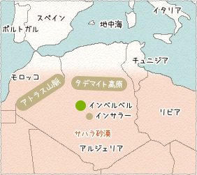 サハラ砂漠の真ん中、タデマイト高原の南にインベルベルという村があります。インは「泉」という意味を持つアラビア語。18世紀中頃にこの地にやってきた聖人が杖をついた場所に泉を発見し、その近くにベルベルの木が生えていたことから「ベルベルの泉=インベルベル」と名づけられたといわれています。