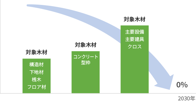 私たちは、森林破壊ゼロ達成のため、森林破壊ゼロ方針、人権や労働に関する方針を掲げるサプライヤーから、下記合法性と持続可能性を確認した木材、または、100%リサイクル木材を調達します。