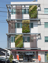 太陽光発電パネルや壁面緑化などの環境アイテムを設置することができる多機能タイプの外裝フレームです。創エネや日射遮蔽などで事務所の環境性能を高めるとともに、変化のある外裝デザインを演出しています。
