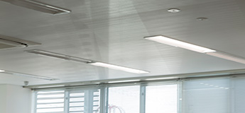 執務室は、アンビエント(全般)照明にタスク(作業)照明を組み合わせるとともに、天井の高拡散反射材との相乗効果で、従來より低い照度でも明るさ感のある空間を実現。さらに、照度センサーで自然光を測定し、LED照明を調光することで、照明電力を削減しています。
