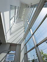 窓からの光を天井側に跳ね上げる機能を持つ窓フィルムで室內へ導光したり、夏の高い位置からの日射を遮り、冬の低い位置からの日射は取り込めるフィルムを使用し、空調負荷を軽減します。