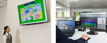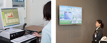 ビル內で使用される電気やガスなどの消費量を測定し、グラフとして「見える化」してパソコンで空調?照明設備の監視?制御を行うことで、ランニングコストを低減します。また、1階リビングサロンにエネルギーモニターを設置し、「見せる化」によって環境負荷低減の取り組みを周知しています。