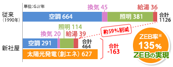 従來(1990年)と新社屋のエネルギー消費量を比較。新社屋では高効率空調機やLED照明などで従來比約59%の省エネを進め、屋根上と敷地に設置した太陽光発電で創エネを実現。その結果、消費エネルギーに対する創エネルギーの割合を示すZEB率が135%となった