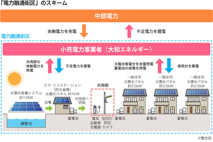 具體的には、融通街區內の太陽光発電の発電電力と蓄電池の放電電力は、集會所については余剰を、住宅については全量を當社グループ會社の大和エネルギーが買い取り、融通街區內の電力需要があるところに電力を配電します。