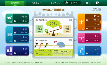 さらに、各戸からデータを収集し、まち全體のエネルギーを見える化するシステムが「SMA×ECOクラウド」です。これは、まち全體のエネルギー利用狀況等の確認や當社が開発した全國のスマートタウンとの比較ができます。