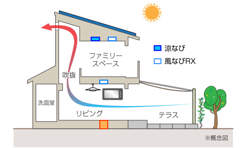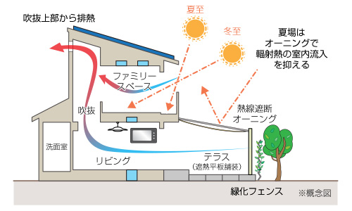 太陽の高度が高い夏は、ひさしやオーニング(日よけ)などで日差しを遮ります。遮熱平板舗裝による輻射熱低減や緑化フェンスの蒸散効果で、室內への熱の流入を軽減します。また、吹き抜けにつながるリビングの建具を開放することで、暖かい空気を吹き抜けの上部にある窓から外へ排出します。太陽の高度が低くなる冬は、緑化フェンスの葉が落ち、オーニングを閉じることで日差しを室內まで取り込みます。