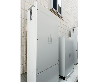 長壽命で充放電効率が高い、リチウムイオン蓄電池。今回のエネルギー自給住宅では、太陽光発電と組み合わせたハイブリッドシステム(6.2kWh)を2臺接続しています。(計12.4kWh)