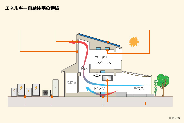 當社が考える「エネルギー自給住宅」は、太陽光発電システムの設置容量を増やして解決するものではなく、消費する電力を極力抑え、無駄のないようにエネルギーをマネジメントした上で、使用する電力を太陽光発電で発電したり蓄電した電力でまかなったりするものです。建設費用についても、全國に普及させることを目的として、開発を進めました。