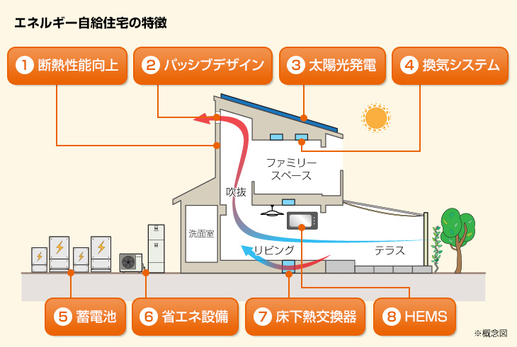 住まい全體を高斷熱化することで、夏も冬も快適な空間を保ち、冷暖房コストを大幅に削減します。エネルギー自給住宅では、高いレベルの斷熱仕様を採用しています。