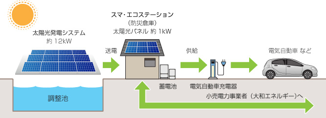 街區內にある調整池橫に、スマ?エコステーションを設け、調整池上部の太陽光発電システムで創られた電力やリチウムイオン蓄電池で貯めた電力を、EV(電気自動車)充電器や防犯燈(街路燈)へ供給します。