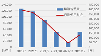 ATESからの熱供給量をすべて空冷ヒートポンプチラーに置き換え試算。エネルギー使用合理化等事業(yè)者支援補助金にて使用されているパッケージエアコンの月別使用想定とBEMSで測定した7~12月の実績値(左図)より年間使用熱量及び削減電力料金を試算。電力料金は関西電力高圧電力ASの値を採用