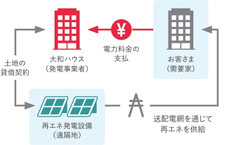需要場(chǎng)所から離れた場(chǎng)所に発電設(shè)備を設(shè)置し、発電した電力を需要場(chǎng)所に供給するモデル。