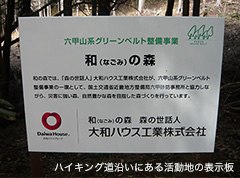 大和ハウス工業は、土砂崩れ防止等を目的とした「六甲山系グリーンベルトの森づくり」に參加しています。六甲山の在來種の植樹や下草刈り、間伐などの森林整備を行い、季節ごとにさまざまな自然を楽しめる憩いの場とすることを目指しています。