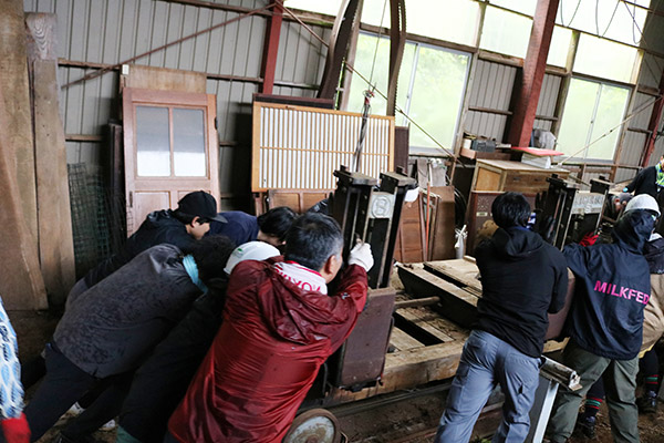 今年度は、製材機(jī)の復(fù)活を目標(biāo)に、まずは製材所で加工した木材を運(yùn)搬できるようにするため、「製材所の清掃から間伐作業(yè)まで」を毎月実施することとしました。第1回は、それぞれの事業(yè)所の地域共生推進(jìn)委員をはじめとした15名が集まり、足の踏み場もないほど散亂している木材などを片付けることから始めました。第2回は、原木を製材機(jī)に送る臺車の上に積み重なった百本以上ある木材を撤去するためにリレー形式で屋外へ搬出する作業(yè)を行いました。作業(yè)開始から數(shù)時間後、臺車とレールがようやく全貌を現(xiàn)しました。最後は棟梁の「ヤァッ」という“宮大工式かけ聲”に合わせ、全員で臺車を押すと……「動いた!」と歓聲が沸き起こりました。今回參加した14名は、活動前に「地域の取り組みを知り、私たちが関わる意義を感じたい」など意気込みを述べていたことからも、活動を通じて視野を広げる良い機(jī)會となりました。次回以降は、昭和34年製の製材機(jī)が電気で動くのかについて確認(rèn)していきます。