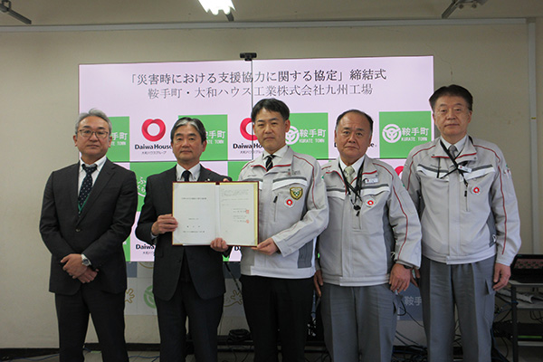 1つ目は、鞍手町との防災協定「災害時における支援協力に関する協定書」の締結です。工場周辺は、過去に一級河川である遠賀川の支川が氾濫し、たびたび浸水被害が発生しています。工場のある場所は、ハザードマップでリスクが示されていないため、災害発生時に、地域の方々の避難場所や、非常食、衛星攜帯電話などの設備を提供する協定を結びました。工場の駐車場は、災害救援物資を運ぶヘリコプターの離著陸にも活用できます。