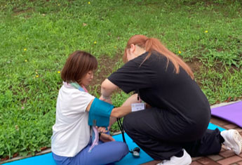 概要:公園で朝ヨガを実施。ヨガをする前後で、G街區の看護學生と日本ヨーガ療法士の協力団體の方が參加者の血圧を測り、參加者に體の変化をヨガと血圧數値から認識して頂きました。