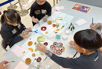 概要:地域の児童會館に通う子どもたちがインストラクターになり、規格外や切れ端となった、捨てられてしまう野菜でスタンプを作り、參加者と絵ハガキを作成しました。大人も子どもと一緒に夢中になって、それぞれに個性あふれる色鮮やかな絵ハガキを作りました。