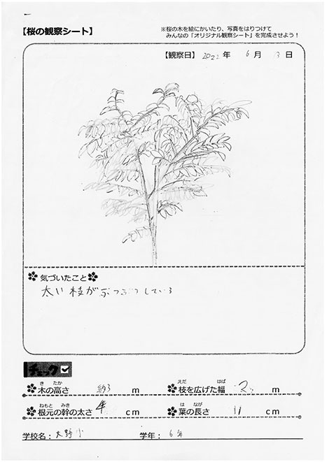 3年間ですくすくと成長しているようじゃのぉ。みんなが大切にお世話をしてくれているから、桜もいきいきとしておるぞい。數年後には、みんなのためにきれいな花を咲かせてくれるじゃろう。(さくじい)
