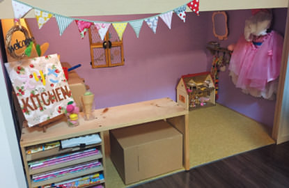 押し入れを改造した「子どもの秘密基地」。內部を塗裝し、おままごと用のミニキッチンを設置。鏡や洋服のフックを取り付けてお姫様に変身できる空間に〈英はなぶささん作(※2)〉。