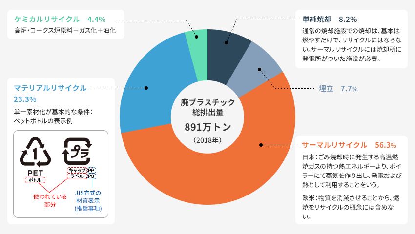 日本におけるプラスチック処理方法は、単純焼卻は8.2%で、埋立7.7%、殘り約85%はリサイクルされているというデータがあります。