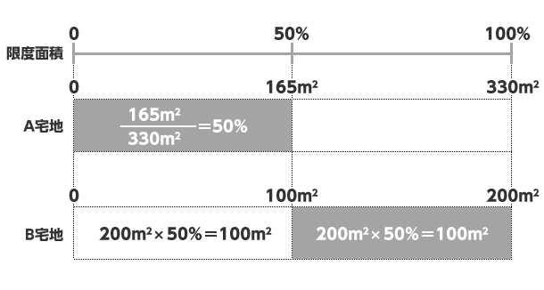 (A)は330m2選択できるところを165m2しか選択していませんので50%の割合しか選択していないと考えます。しかし、100%に達するまで面積を選択できますので殘りの100%-50%=50%を(B)に使っていくことができます。