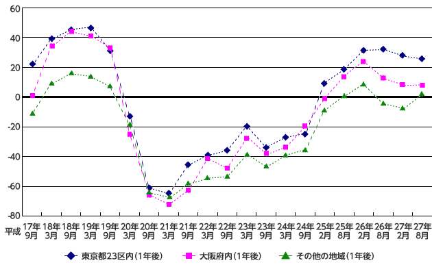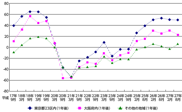 しかし、1年後の土地取引の予想に関して、「東京」は2.4ポイントの低下、「大阪」は0.7ポイント低下となっており、「その他の地域」では10.0ポイント上昇しました。
