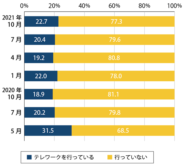 公益財団法人日本生産性本部の調査結果レポート「第7回働く人の意識に関する調査」(20歳以上の1,100人を対象)によると、テレワークは2020年4月7日に初めて緊急事態宣言が出された直後の5月には31.5%の人が「行っている」と答えました。その後も20%前後を保っています。