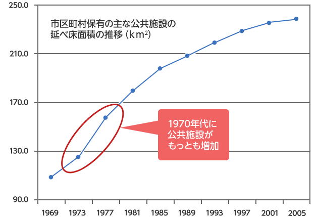 総務省自治財政局財務調査課の調査によれば、全國の自治體における公共施設は1970年代にもっとも増加しており、これらの老朽化対策が問題となっています(下図參照)。