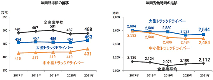 トラック業界の年間平均所得(図1)は?2021年度で大型車は463萬円?中小型車で431萬円?全産業平均(489萬円)と比べるとそれぞれ26萬円?58萬円低くなっています?年間労働時間で見ると?大型車のドライバーは全産業平均の約1.2倍?運転手の平均年齢は他の産業と比べて3歳から6歳程度高くなっています?