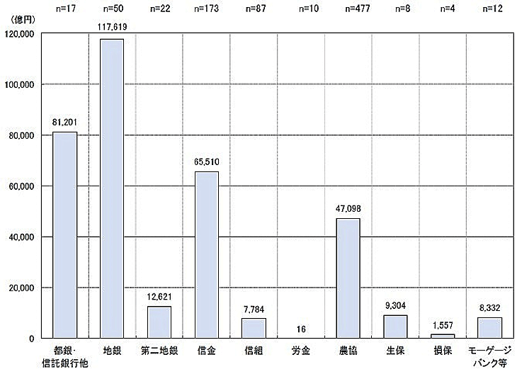 貸出殘高(各年集計)は2021年度が35兆1,043億円。対前年比5.4%と微増。業態別の貸出殘高も新規貸出額と同様で、地方銀行11兆7,619億円(5.8%増)とトップ。2位は都銀?信託で8兆1,201億円(3.1%増)、信用金庫6兆5,510億円(17.1%増)、農協4兆7,098億円(2.2%増)などとなっています。