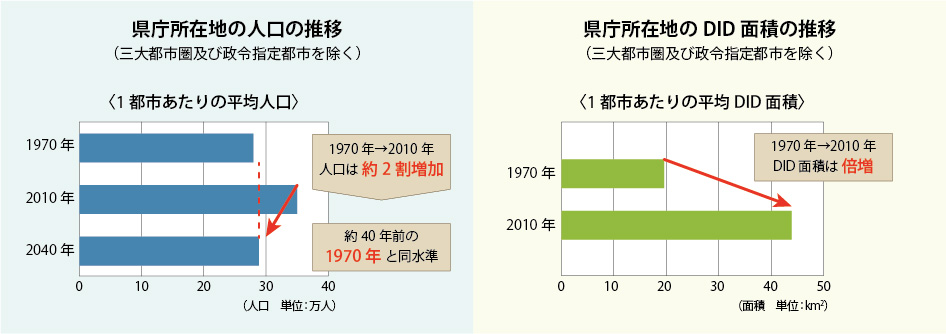 しかし、この人口増加の都市部においても、DID(人口集中地區(qū))の面積は、特に県庁所在都市においては拡大しています。1都市あたりの平均人口は約2割増加したのに対して、1都市あたりの平均DID面積は大きく増えています。つまり、合併や郊外の開発によって、人口の増加以上に、市街地が拡散し、広がったといえます。
