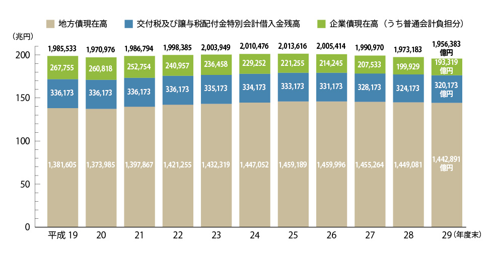 借入金殘高は平成25年をピークに微減しているものの、平成29年度末の借入金殘高(地方債、交付稅特會借入金、公営企業(yè)債)は約196兆円に膨れ上がったままです。今後の財政運営はより一層厳しいものになることが予想されます。