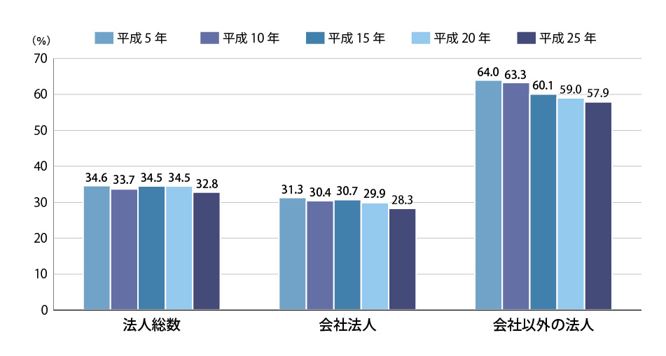 ちなみに、「會社以外の法人」は17萬7千法人で、土地所有率は57.9%と高くなっています。ただし、平成20年に比べると1.1ポイント低下しています。「會社以外の法人」とは、社會福祉法人、學校法人、醫療法人、宗教法人などで、どちらかといえば土地の所有を前提とした事業活動を行う法人が多いため、土地所有率が高いようです。