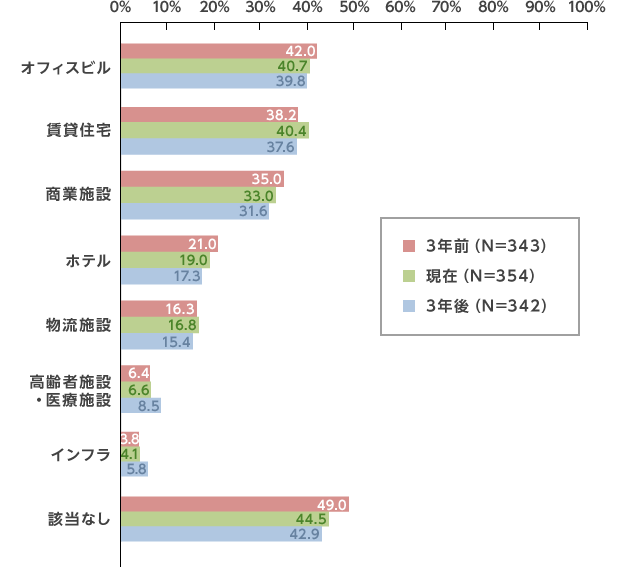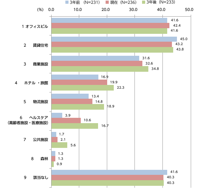 一方、「3年後」に投資していると想定される不動産等の用途では、「オフィスビル」「賃貸住宅」が概ね橫ばい傾向であるのに対し、「商業施設」「ホテル?旅館」「物流施設」「ヘルスケア(高齢者施設?醫療施設)」などが拡大傾向にあり、投資先の多様化が進行しています。特にヘルスケアへの投資に関しては、3年前と比べると大きな伸びを示しています。今後予想される超高齢社會を考えると、社會的なニーズも含めて、今後も増加していくと思われます。