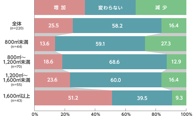 標(biāo)準(zhǔn)的売場面積別(表2)に見ても同様の傾向がうかがえます。売場面積の拡大とともに「増加」の回答割合が高くなり、売場面積1,600m2以上の企業(yè)では「増加」の回答割合が半數(shù)を超えています。