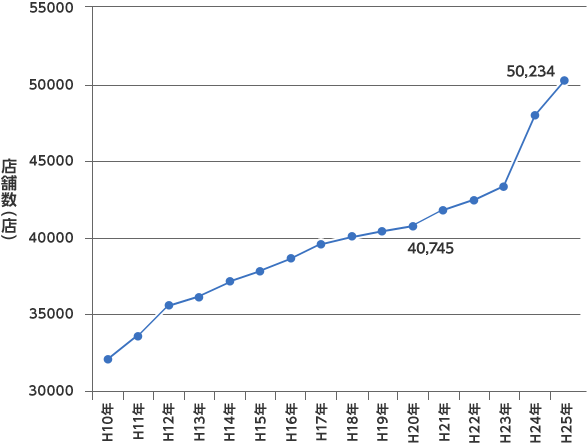 小売業(yè)全體が低迷する間もコンビニエンスストアの販売額は拡大の一途をたどり(表3)、平成21年にはついに百貨店の販売額を抜き、平成25年には店舗數(shù)が5萬店を超えました(表4)。