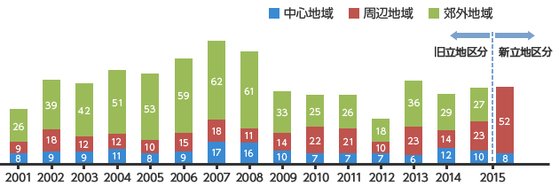 一方で、2015年における新規(guī)1店舗當(dāng)たりの平均面積(表6)は19,942m2となっており、2008年の27,791m2をピークに、2009年以降は20,000m2前後で推移しています。この背景には、2007年の都市計畫法の改正により、土地用途が制限されて大型ショッピングセンターの郊外出店が難しくなっていることが挙げられます。