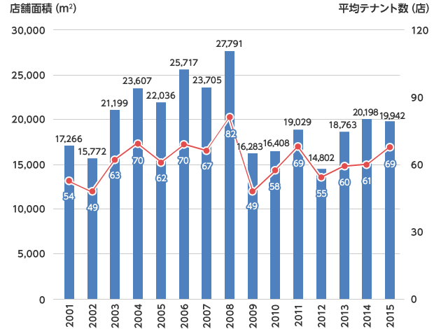 表6:オープン1SC當(dāng)りの平均店舗面積とテナント數(shù)の推移