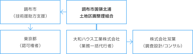 実際の土地區畫整理事業は、大和ハウス工業(株)に業務一括代行(事務局運営、調査設計、造成工事、保留地取得)を受託して頂き、安心して調布市國領北浦土地區畫整理組合を運営することができました(図1參照)。
