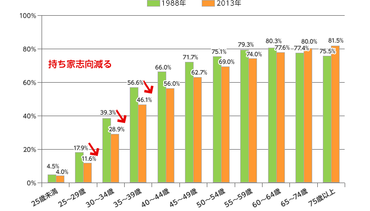 1988年と2013年の年齢別持ち家比率を比べたのが図2です。