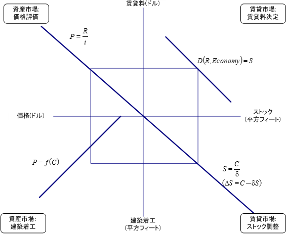 このように決定された新しいストック量が、第一象限に戻り、そのストック量と次の需要量に応じて新しい家賃が決定されるという循環を持っていると考えられています。