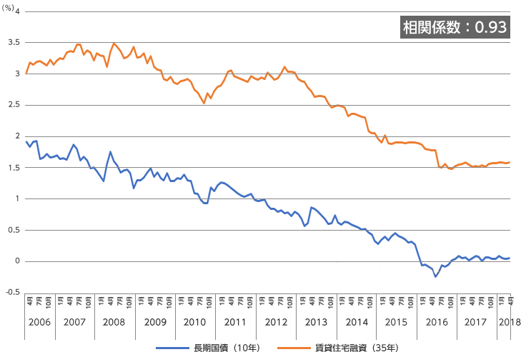 上図は、2006年からの賃貸住宅融資金利(35年固定、繰り上げ返済なし)と長期國債(10年)の推移を示したものです。これらをみると、ほとんど同じような動(dòng)きを示しています。2つの関係の強(qiáng)さを表す相関係數(shù)は0.93となっており、これは極めて強(qiáng)い相関関係にあると言えます。