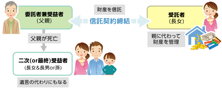受託者を法人とすれば、個人と違い、死亡リスクがないため、契約の安定を図ることができます。また、長男個人へと名義変更をするのではなく「一般社団法人○○家ファミリートラスト」等とすることで、父親の心理的ハードルを下げることができます。