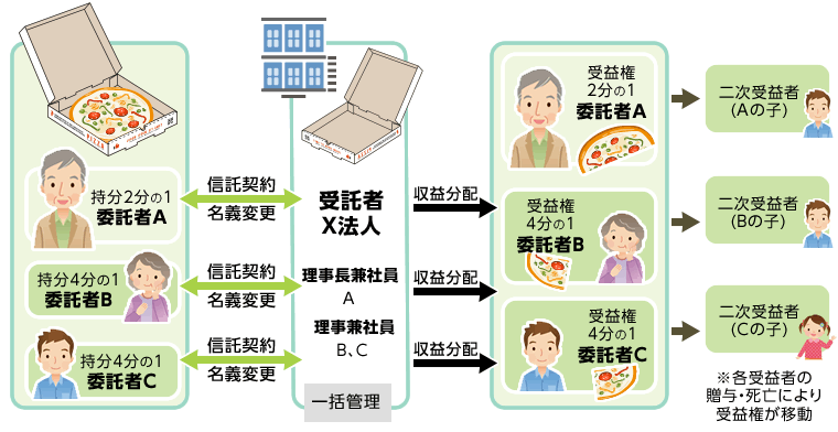 信託を組めば、財産権はそれぞれの持ち分のまま、名義だけを息子ひとりにまとめることができます。「箱」はひとつにして息子が持ち、中身の「ケーキ」は父親が二分の一、母親と息子が四分の一ずつ持つ、というわけです。
