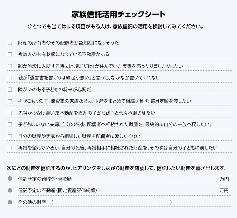 一つでも當てはまる項目がある人は、家族信託の活用を検討してみてください。